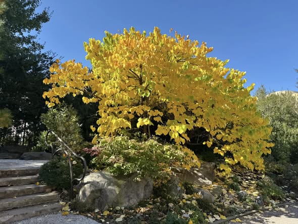 В полусянката на вече порасналия церцис се вписват чудесно компактни японски кленове ,както и вибурнуми.Можете да добавите в композицията и декоративни треви като Miscanthus sinensis ‘Boucle’ PBR,