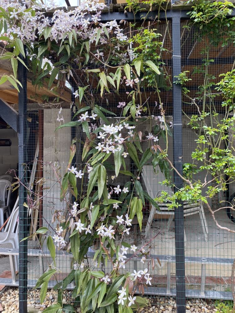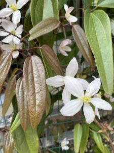 Малко по-взискателен към студа,но разположен на завет до стена големите му лъскави вечнозелени листа ще покрият с прекрасната си мантия пространството ,а рано напролет се появяват и тъмнорозовите пъпки,които се отварят в бледо розови цветчета с жълти тичинки и лек бадемов аромат.Колкото по-хладно е времето,толкова по-дълго се задържат цветовете .Дори и след прецъфтяване този клематис е красива гледка с широките си и дълги кожести листа и шоколадовия цвят на младият прираст.