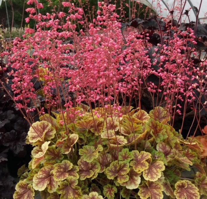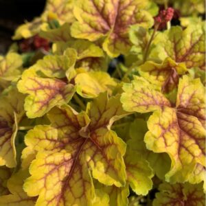 e отличен избор сред разнообразието от жълтолистни хойхери. Нейните камбанки са в ярко розов цвят,който хармонира красиво с малиново-червените вени по листата.Пролетните млади листа са бронзово -червени ,за да се променят в меко жълто с жилки през лятото. Ако е на по-плътна сянка жълтия цвят може да избледнее до лайм-зелено..Тази малка прелест е с отлична жизненост,растеж и устойчивост предвид компактните си размери.Ако ще я засаждате в група,то нека не е между по-големи и обемни хойхери,които биха я затиснали или отвлякли вниманието от нежната и красота .