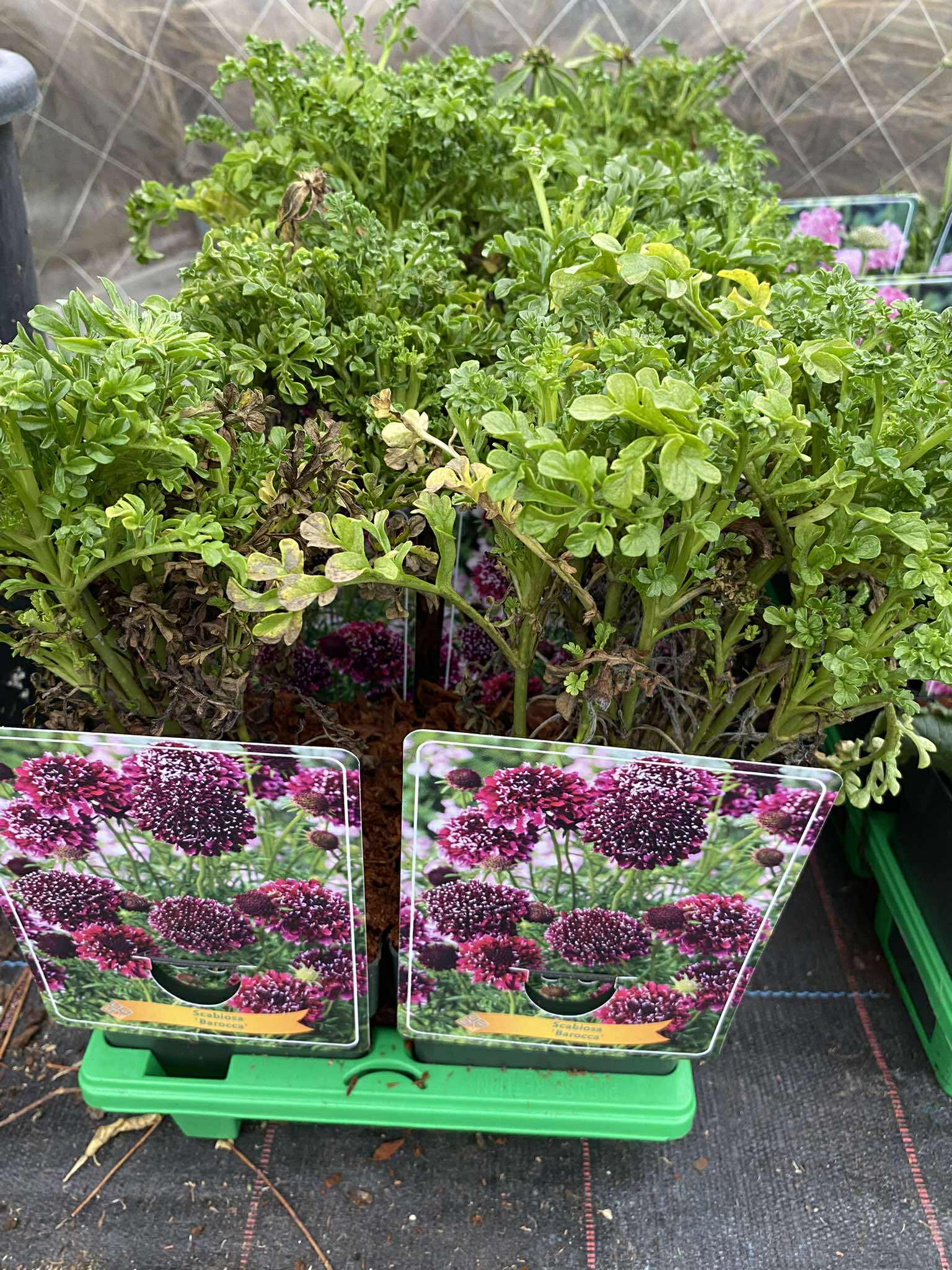 - Scabiosa columbaria “Barocca“-пурпурни кошнички с бели връхчета.